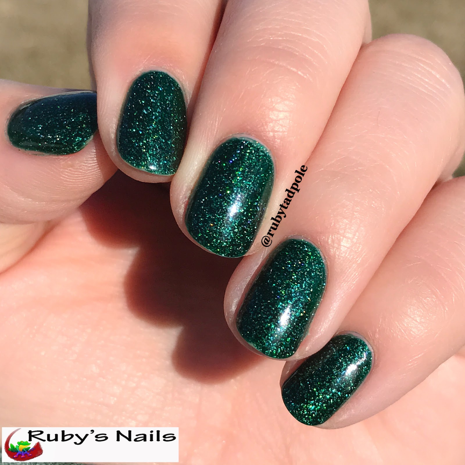 Dollish Polish 1-Up is, I believe, discontinued. It's most green hex glitters with some white matte hex glitters and white matte bar glitter. Any other glitter polish would work with this look as well. This mani is a great way to feature any glitter polish you have.