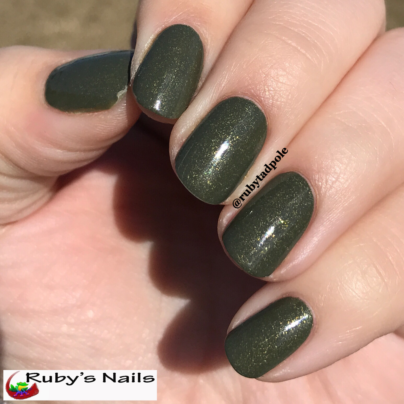 The formula is wonderful. It goes on in 2 smooth, easy coats. It's an army/olive green with fine gold glitter throughout. The glitter is very fine so no need for a super thick top coat.